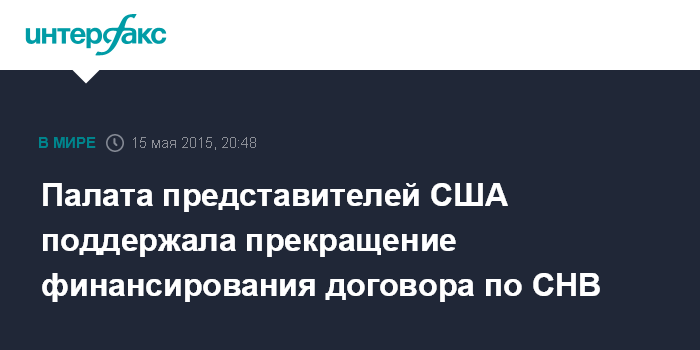 Москва. 15 мая. INTERFAX.RU - Члены палаты представителей США поддержали предложение, предусматривающее в случае утверждения приостановку финансирования программ по реализации заключенного с РФ договора по Стратегическим наступательным вооружениям (СНВ), сообщает в пятницу агентство Bloomberg.