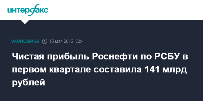 Москва. 15 мая. INTERFAX.RU - Чистая прибыль "Роснефти" по РСБУ в I квартале 2015 года составила 141 млрд руб. Для сравнения, годом ранее компания закончила первый квартал с убытком в 39,6 млрд руб.