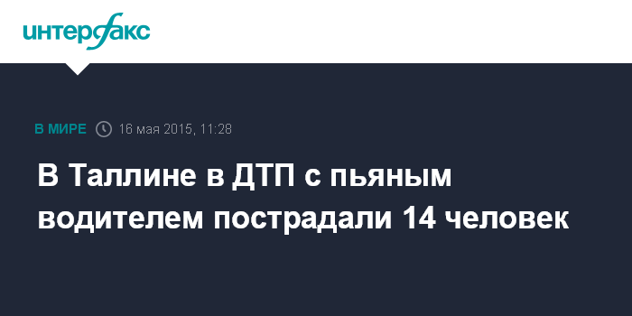 Москва. 16 мая. INTERFAX.RU - По предварительным данным, 14 человек пострадали в субботу в ДТП в центре Таллина по вине пьяного водителя.