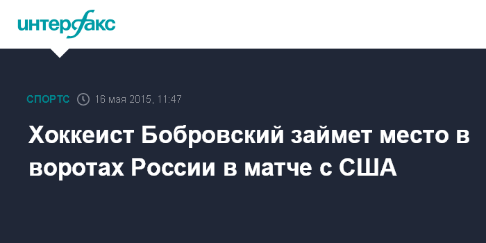 Москва. 16 мая. INTERFAX.RU - Сергей Бобровский займет место в воротах сборной России в матче 1/2 финала чемпионата мира по хоккею против США, сообщает пресс-служба Федерации хоккея России.