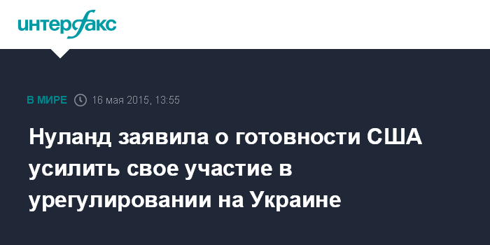 Москва. 16 мая. INTERFAX.RU - США готовы усилить свое участие в урегулировании ситуации на востоке Украины, заявила помощник госсекретаря США Виктория Нуланд.