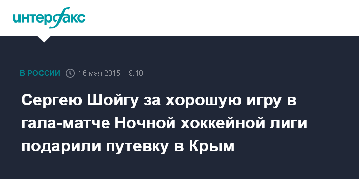 Москва. 16 мая. INTERFAX.RU - Министр обороны Сергей Шойгу как лучший игрок гала-матча Ночной хоккейной лиги получил приз в виде путешествия в Крым.