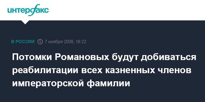 Москва. 7 ноября. INTERFAX.RU - Императорский Дом Романовых намерен добиться реабилитации всех членов императорской фамилии, которые были казнены большевиками после революции.