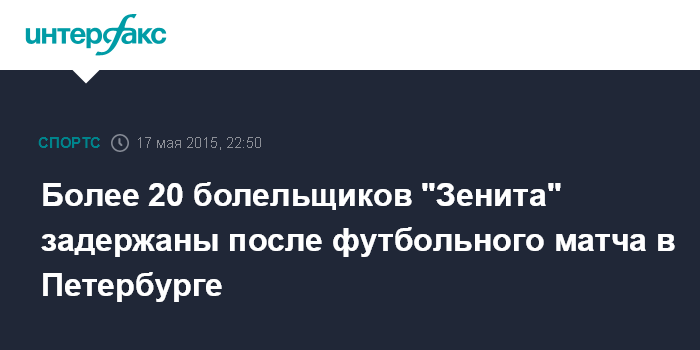 Москва. 17 мая. INTERFAX.RU - Полицейские задержали 23 человека после матча на стадионе "Петровский", где местный "Зенит" встречался с футбольным клубом "Уфа", сообщили "Интерфаксу" в ГУ МВД по северной столице в воскресенье.
