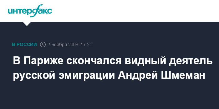 Москва. 7 ноября. INTERFAX.RU - Один из старейших русских эмигрантов "первой волны", последний подданный Российской империи Андрей Шмеман скончался в пятницу в Париже на 88-м году жизни от продолжительной болезни, сообщили "Интерфаксу" в Русской православной церкви.