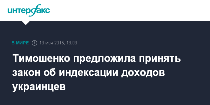 Москва. 18 мая. INTERFAX.RU - Лидер парламентской фракции "Батькивщина" в Верховной раде Украины Юлия Тимошенко зарегистрировала законопроект о внесении изменений в государственный бюджет на 2015 год относительно индексации доходов граждан.