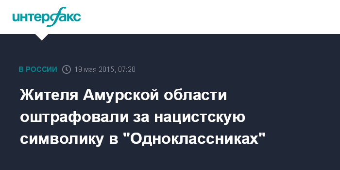 Москва. 19 мая. INTERFAX.RU - Пользователь интернета в Амурской области оштрафован решением Белогорского мирового судьи за публичную демонстрацию нацистской символики на своей странице в соцсети.