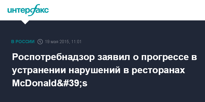 Москва. 19 мая. INTERFAX.RU - Роспотребнадзор и сеть ресторанов быстрого питания McDonald's ведут консультации по устранению нарушений, которые были выявлены в ходе недавних проверок по линии санитарной службы, сообщила руководитель Роспотребнадзора, главный государственный санитарный врач РФ Анна Попова.