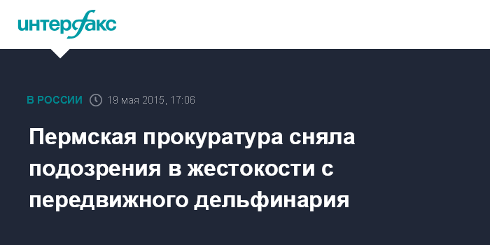 Москва. 19 мая. INTERFAX.RU - Контролирующие ведомства Перми завершили проверку передвижного дельфинария, которая началась после появления в местных СМИ информации о жестоком обращении с двумя белухами и морским котиком, сообщает пресс-служба прокуратуры региона.