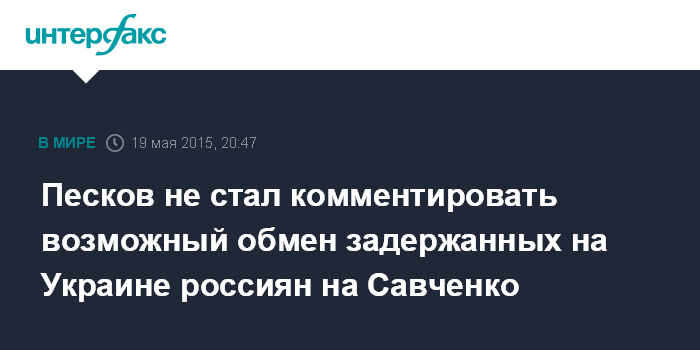 Москва. 19 мая. INTERFAX.RU - В Кремле не комментируют возможность обмена двух россиян, задержанных на Украине, на летчицу Надежду Савченко.