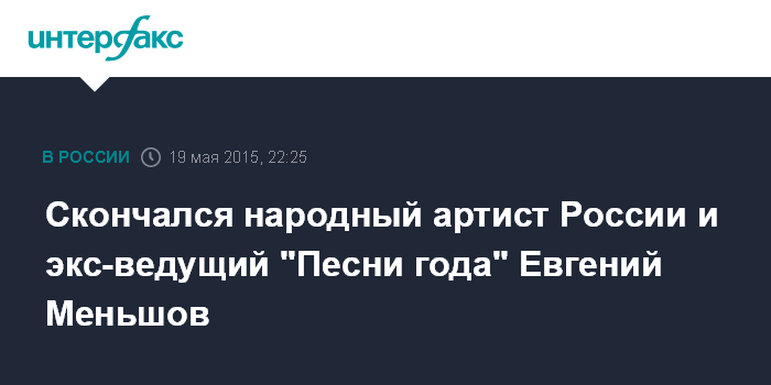 Москва. 19 мая. INTERFAX.RU - На 69-м году жизни скончался народный артист России, экс-ведущий "Песни года" Евгений Меньшов. Об этом сообщил "Московский комсомолец" со ссылкой на его супругу Ольгу Грозную.