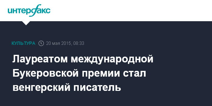 Москва. 20 мая. INTERFAX.RU - Международную Букеровскую премию, вручаемую, в отличие от традиционной Букеровской премии, не только современным англоязычным авторам, получил 61-летний венгерский писатель Ласло Краснахоркаи, сообщается на сайте премии.