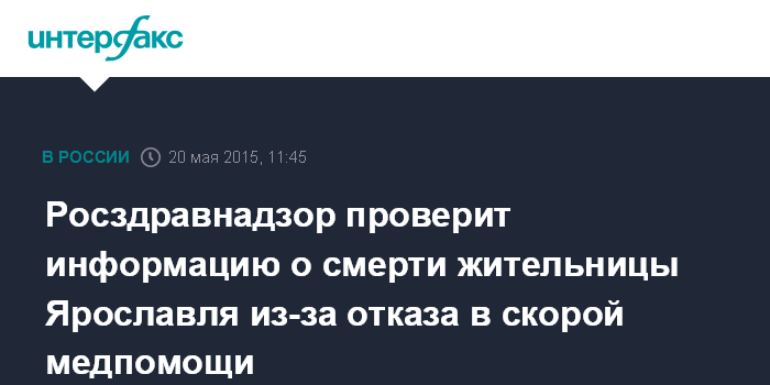 Москва. 20 мая. INTERFAX.RU - Минздрав России проводит проверку в связи с неоказанием скорой помощи жительнице Ярославля, которая умерла.