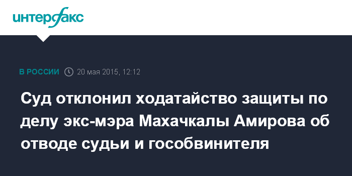 Москва. 20 мая. INTERFAX.RU - Адвокат Зубаира Мутаева, одного из подсудимых по делу бывшего мэра Махачкалы Саида Амирова, в среду обратился к Северо-Кавказскому окружному военному суду с требованием отвода председательствующего суда и гособвинителя.
