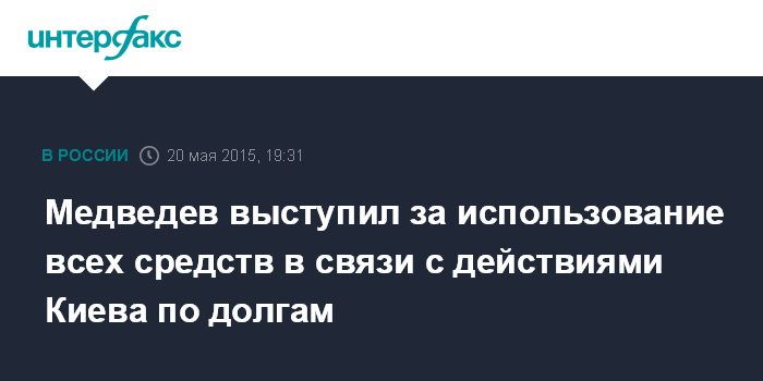 Москва. 20 мая. INTERFAX.RU - Глава российского правительства Дмитрий Медведев заявил о необходимости использования российской стороной всех средств защиты своих интересов в связи с принятыми Верховной Радой Украины решениями по долгам иностранным партнерам.