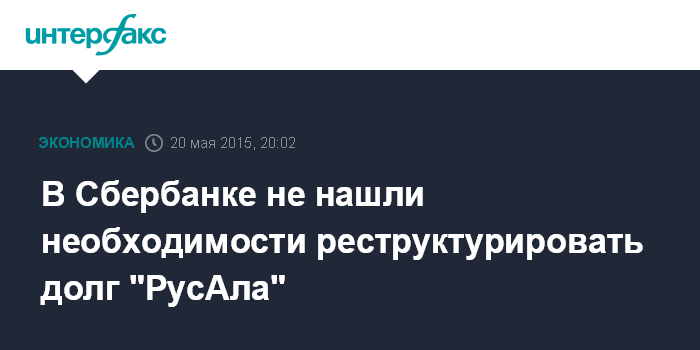 Москва. 20 мая. INTERFAX.RU - Долг "РусАла" перед Сбербанком не требует реструктуризации, заявил первый зампред правления Сбербанка Максим Полетаев на пресс-конференции в среду.