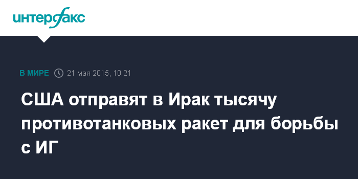 Москва. 21 мая. INTERFAX.RU - Ирак получит от США тысячу противотанковых ракет для противодействия боевикам из радикальной группировки "Исламское государство" (ИГ), сообщает The New York Times.