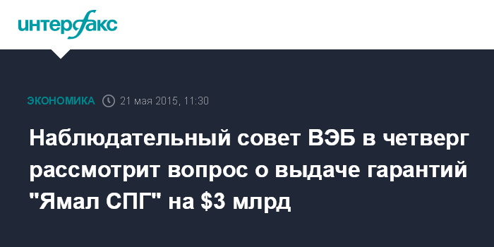 Москва. 21 мая. INTERFAX.RU - Наблюдательный совет Внешэкономбанка в четверг рассмотрит вопрос о предоставлении гарантий со стороны банка в адрес ОАО "Ямал СПГ", строящего завод по сжижению природного газа (СПГ), сообщили "Интерфаксу" несколько источников, знакомых с повесткой заседания совета.