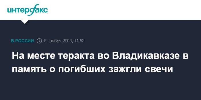 Москва. 8 ноября. INTERFAX.RU - В память о погибших в результате теракта 6 ноября во Владикавказе на место взрыва люди с утра субботы приносят живые цветы, зажигают поминальные свечи.