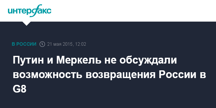 Москва. 21 мая. INTERFAX.RU - Тема возвращения России в "большую восьмерку" не затрагивалась на недавних переговорах в Москве президента России Владимира Путина и канцлера ФРГ Ангелы Меркель, сообщил пресс-секретарь главы российского государства Дмитрий Песков.