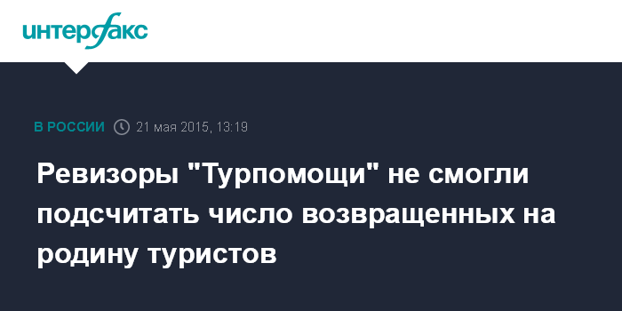 Москва. 21 мая. INTERFAX.RU - Контрольно-ревизионной комиссии объединения туроператоров по выездному туризму "Турпомощь" не удалось установить точное количество туристов, вывезенных из-за рубежа в 2014 году, сообщила председатель комиссии Наталья Китова в четверг.