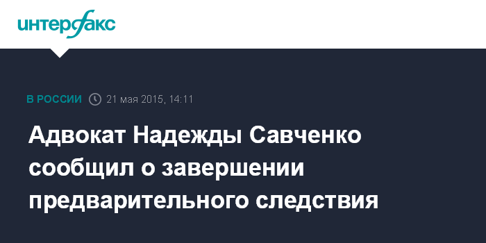 Москва. 21 мая. INTERFAX.RU - Следственный комитет России официально завершил расследование уголовного дела в отношении украинской летчицы Надежды Савченко, обвиняемой в пособничестве в убийстве российских журналистов, сообщает ее защита.