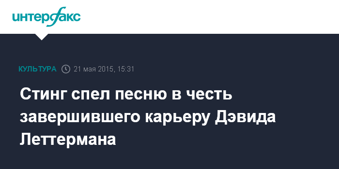 Москва. 21 мая. INTERFAX.RU - Британский музыкант Стинг исполнил песню в честь телеведущего Дэвида Леттермана, который после 23 лет в эфире закончил карьеру и в среду провел свое последнее вечернее шоу. Об этом сообщает The Hollywood Reporter.