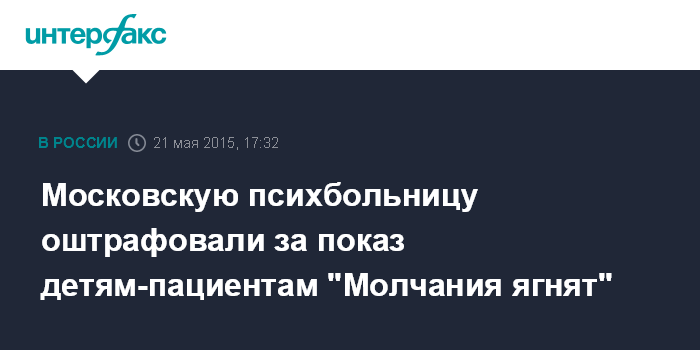 Москва. 21 мая. INTERFAX.RU - Московская психиатрическая больница №15 оштрафована столичным судом за демонстрацию детям с психическими расстройствами американского триллера "Молчание ягнят".