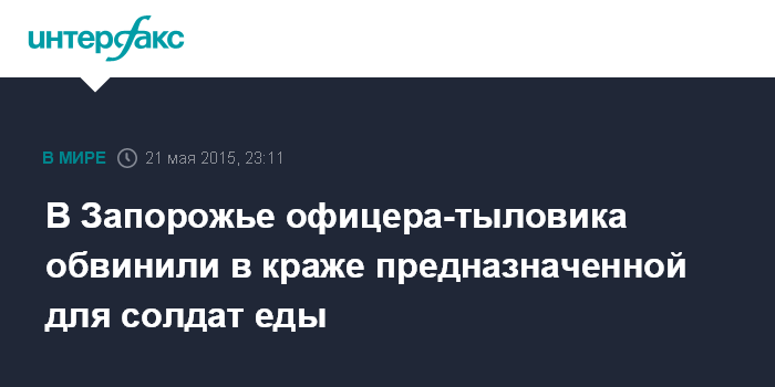 Москва. 21 мая. INTERFAX.RU - Майор национальной гвардии в Запорожье воровал продукты питания и другое имущество, предназначенные для солдат, которые находятся в зоне конфликта на Донбассе. Об этом сообщает центр общественных связей ГУ МВД в Запорожской области