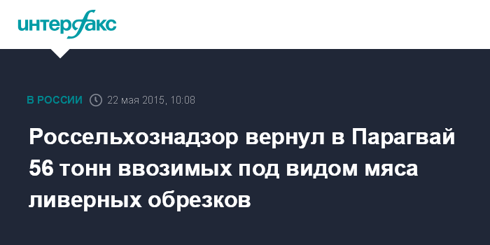Москва. 22 мая. INTERFAX.RU - Россельхознадзор вернул Парагваю 56 тонн животноводческой продукции неприемлемого качества.