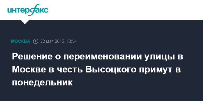 Москва. 22 мая. INTERFAX.RU - Решение о переименовании одной из улиц Таганского района в честь певца и поэта Владимира Высоцкого может быть принято уже 25 мая на заседании городской межведомственной комиссии, сообщил "Интерфаксу" вице-мэр Москвы по социальным вопросам Леонид Печатников.