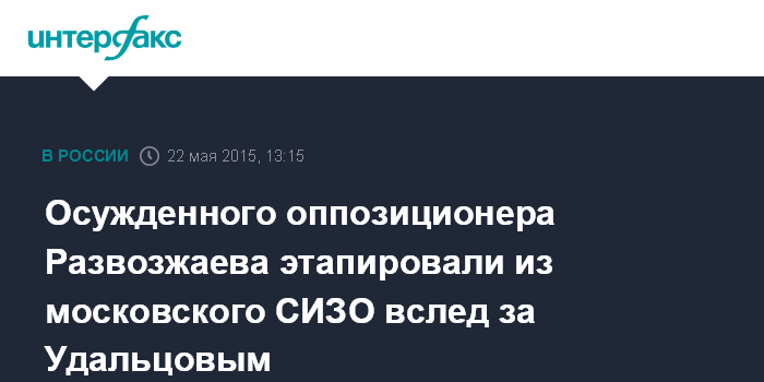Москва. 22 мая. INTERFAX.RU - Оппозиционер Леонид Развозжаев, осужденный вместе с Сергеем Удальцовым к 4,5 года колонии по делу об организации массовых беспорядков на Болотной площади в Москве, этапирован из СИЗО.