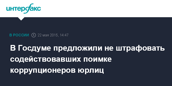 Москва. 22 мая. INTERFAX.RU - Госдума рассмотрит законопроект об освобождении юридических лиц от административной ответственности, если они активно способствовали выявлению факта дачи взятки.