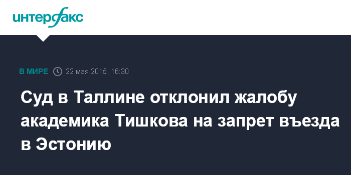 Москва. 22 мая. INTERFAX.RU - Таллинский административный суд не удовлетворил в пятницу жалобу директора Института этнологии и антропологии РАН Валерия Тишкова на запрет въезда в Эстонию до 9 октября 2019 года.