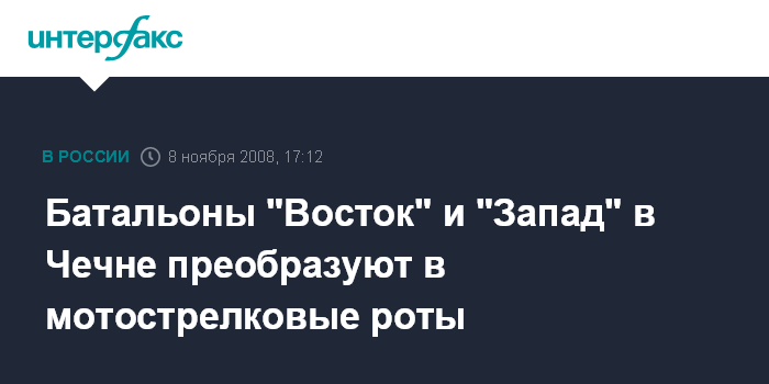 Москва. 8 ноября. INTERFAX.RU - Батальоны спецназа Минобороны РФ "Восток" и "Запад, дислоцирующиеся в Чечне, будут преобразованы в мотострелковые роты, сообщил в субботу агентству "Интерфакс-АВН" заместитель главкома сухопутных войск РФ, генерал-полковник Владимир Молтенской.