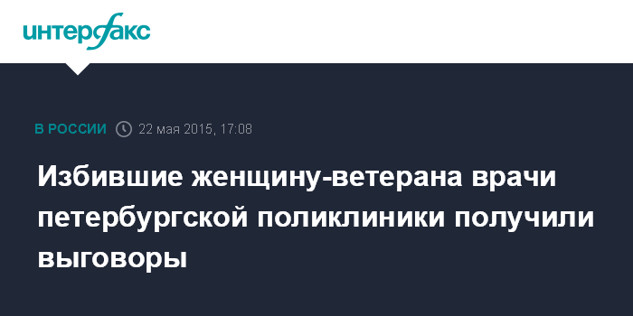 Москва. 22 мая. INTERFAX.RU - Врачи городской поликлиники N100 Невского района Петербурга получили выговоры по итогам служебной проверки инцидента, в котором пострадала пациентка-ветеран.