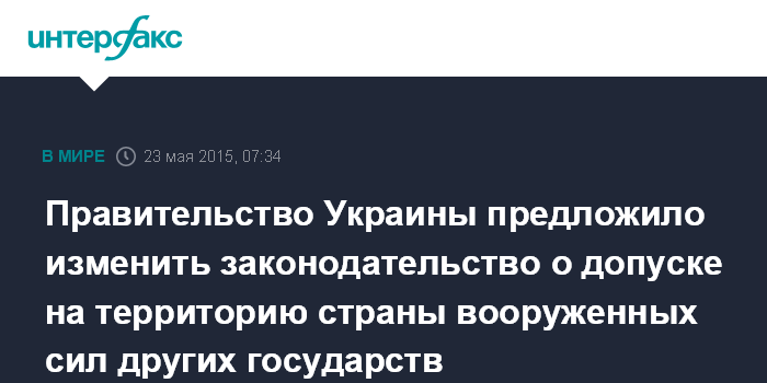 Москва. 23 мая. INTERFAX.RU - Кабинет министров Украины просит Верховную Раду изменить закон о порядке доступа и пребывании вооруженных сил иностранных государств на территории Украины.