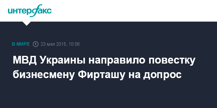Москва. 23 мая. INTERFAX.RU - Министерство внутренних дел Украины направило повестку на допрос и проведение следственных действий украинскому бизнесмену Дмитрию Фирташу, сообщил глава ведомства Арсен Аваков.