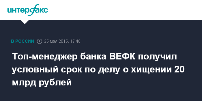 Топ-менеджер банка ВЕФК получил условный срок по делу о хищении 20 млрд рублей