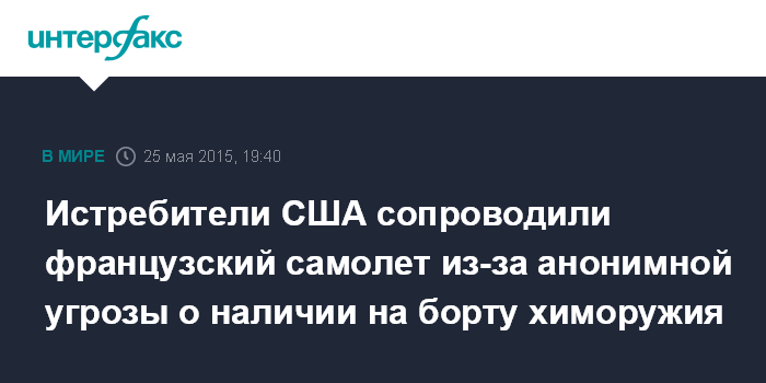 Москва. 25 мая. INTERFAX.RU - Истребители американских ВВС сопроводили самолет компании Air France, следовавший по маршруту Париж - Нью-Йорк, сообщает телерадиокорпорация BBC.