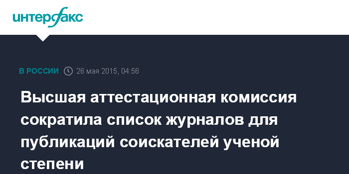 Москва. 26 мая. INTERFAX.RU - Высшая аттестационная комиссия (ВАК) 25 мая представила новый перечень научных журналов, публикация в которых является обязательной для защиты диссертации, сообщает газета "Коммерсант".