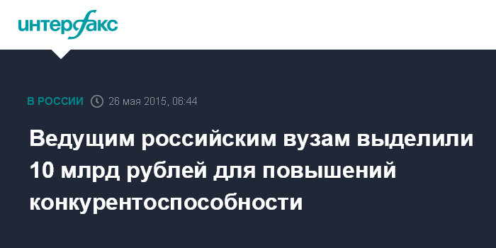"Распределяются средства в размере 10,14 млрд рублей 14 российским вузам. Это будет способствовать увеличению количества российских университетов, занимающих лидирующие позиции в мировых рейтингах университетов, повышению качества российского образования и его конкурентоспособности на мировом рынке образовательных услуг", - сообщает во вторник сайт правительства.