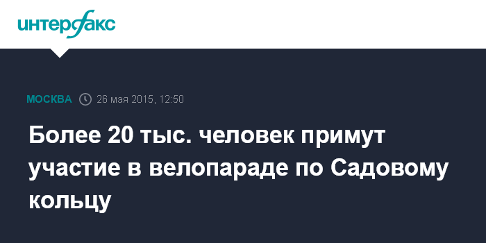 Москва. 26 мая. INTERFAX.RU - Более 20 тыс. человек 31 мая проедут по Садовому кольцу и нескольким бульварам в рамках московского велопарада в поддержку развития велосипедной инфраструктуры и за безопасность на дорогах, сообщает пресс-служба департамента транспорта столицы.