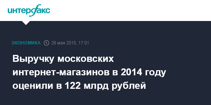 "Совокупный объем выручки онлайн-торговцев за 2014 год авторы исследования оценили в 122 млрд рублей. В Москве работают 18,5 тысячи интернет-магазинов, в которых заняты 85 тысяч человек, подсчитали специалисты", - сообщил во вторник сайт департамента.