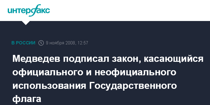 Москва. 9 ноября. INTERFAX.RU - Президент РФ Дмитрий Медведев подписал закон, вносящий изменения в федеральный конституционный закон "О Государственном флаге РФ", сообщили "Интерфаксу" в пресс-службе главы государства.