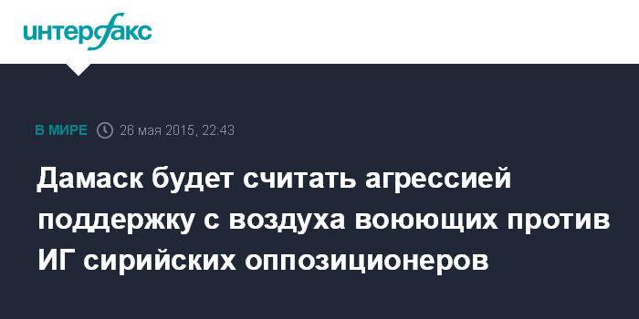 Москва. 26 мая. INTERFAX.RU - Оказание любой страной воздушной поддержки бойцам сирийской оппозиции, ведущим борьбу против ИГ, будет рассматриваться Дамаском как агрессия против Сирии, сообщает сайт ливанского издания Daily Star со ссылкой на слова замглавы МИД Сирии Фейсала Мекдада.