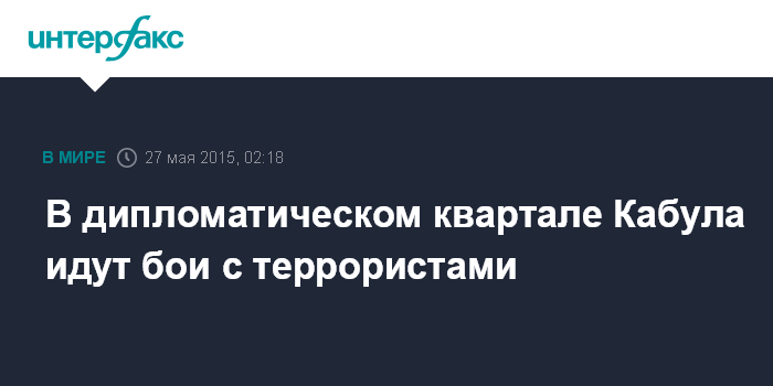 Москва. 27 мая. INTERFAX.RU - Силы специального реагирования, вооруженные тяжелой артиллерией и приборами ночного видения, ведут в столице Афганистана Кабуле в бой с группой террористов, сообщает местный телеканал "TOLOnews".