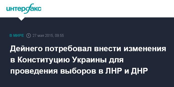 Москва. 27 мая. INTERFAX.RU - Условием проведения выборов в самопровозглашенных Луганской и Донецкой народных республиках является внесение изменений в законодательство Украины, заявил уполномоченный ЛНР на Минских переговорах Владислав Дейнего.