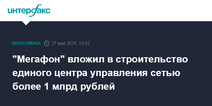 Москва. 27 мая. INTERFAX.RU – Инвестиции "Мегафона" в запуск единого центра управления сетью (ЕЦУС) составили более 1 млрд рублей, сообщил журналистам директор по эксплуатации сети компании Станислав Мирон.