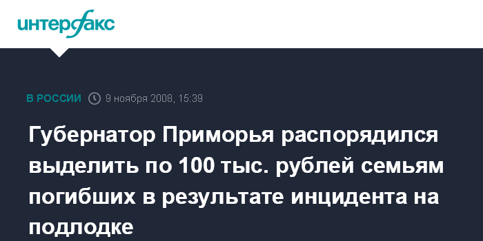 Владивосток. 9 ноября. INTERFAX.RU - Семьи погибших в результате инцидента на российской атомной субмарине в Японском море получат материальную помощь из резервного фонда Приморского края.